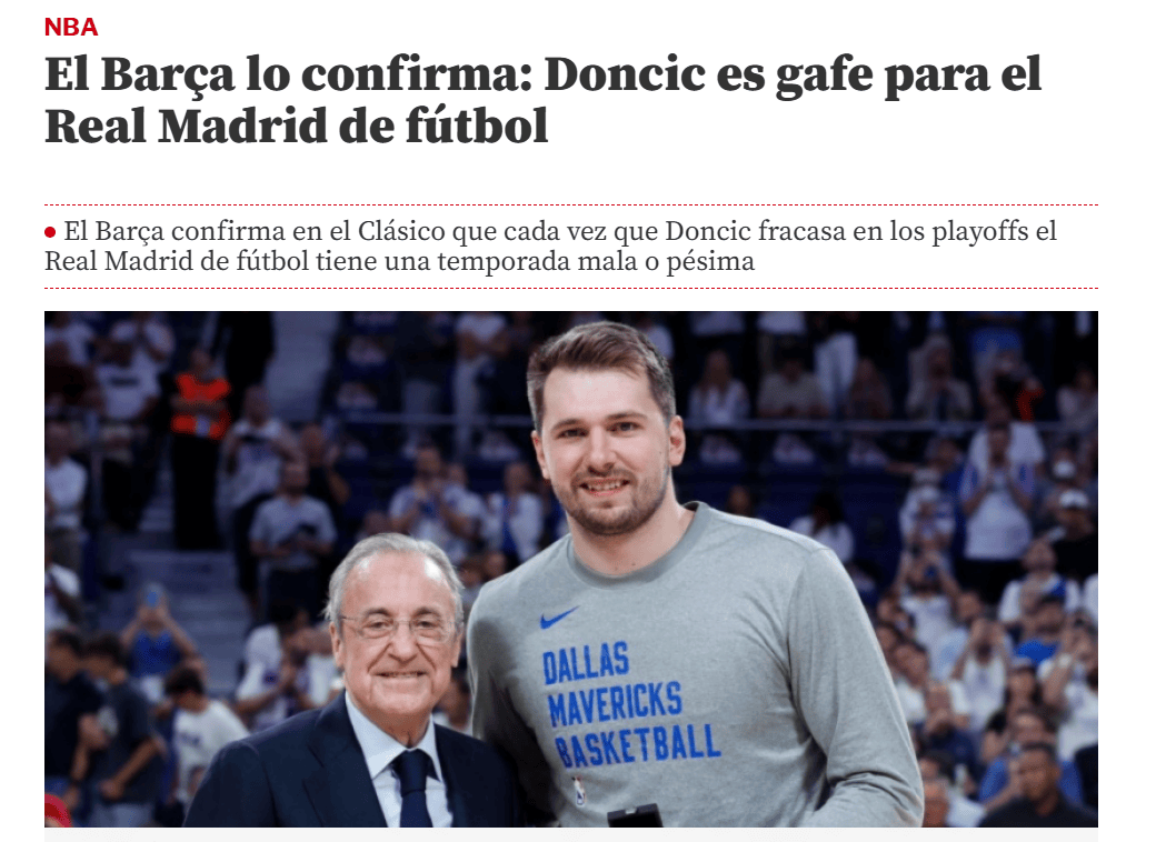 北京时间5月12日消息,2024-25赛季西甲第35轮,皇马客场3-4不敌巴萨,遭遇对手“赛季四杀”,将面临四大皆空的局面。西班牙媒体《世界体育报》撰文分析称,皇马与NBA球星东契奇的境遇基本保持一致,要么都陷入困境,要么都表现出色。2018年,东契奇离开皇马男篮前往NBA打球。